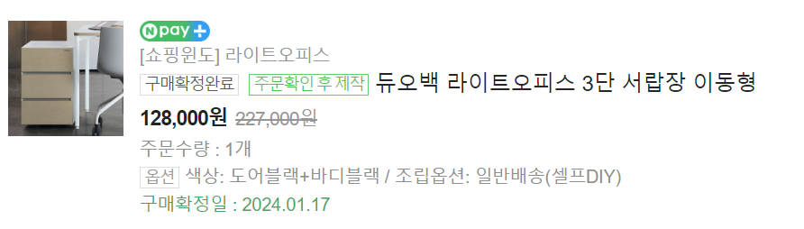 책상과 깔맞춤 하기 위해 도어블랙+바디블랙 색상으로 선택했으며 구매는 네이버 스마트스토어 라이트오피스 공식몰에서 주문을 했습니다. 최종 구매가격은 128,000원 이었어요