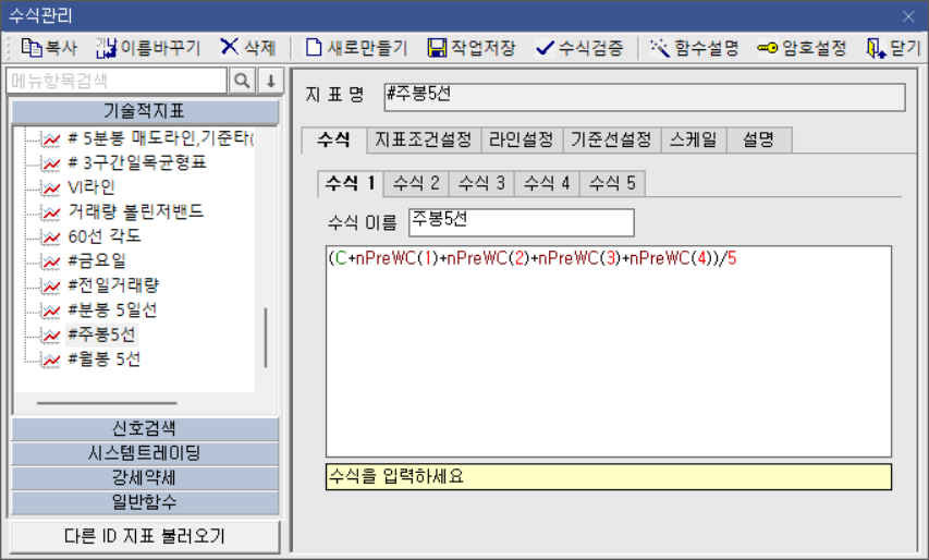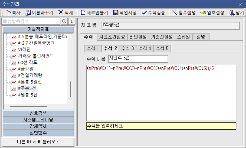 수식관리자 - 기술적지표에서 새로만들기를 통해 주봉5선, 지난주 주봉5선을 수식으로 작성하고 수식검증 및 작업저장을 해줍니다.