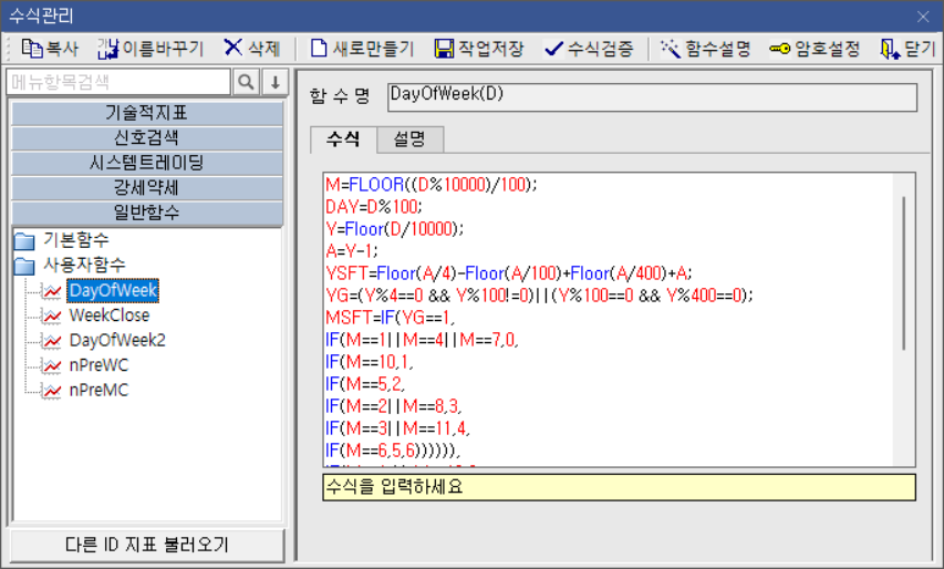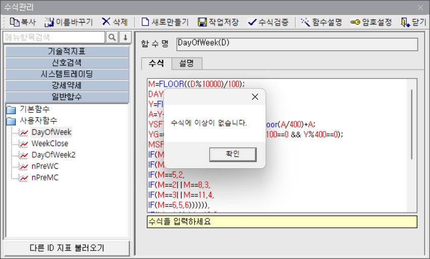 수식관리자 - 일반함수 에서 새로만들기를 통해 함수명 DayOfWeek(D) 그리고 수식 내용을 작성 한 뒤 수식검증 버튼을 누르고 작업저장을 하시면 됩니다.