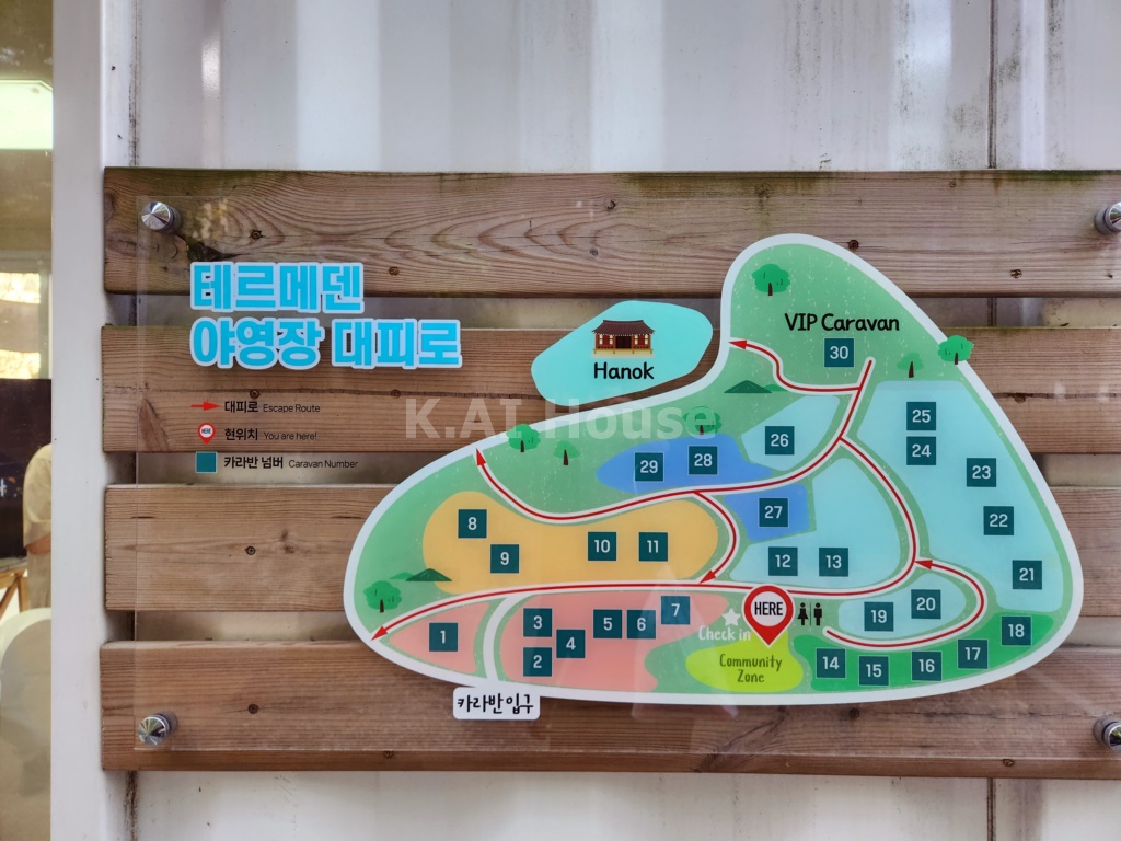 테르메덴 야영장 대피로와 카라반 번호별로 위치정보 표지판이에요