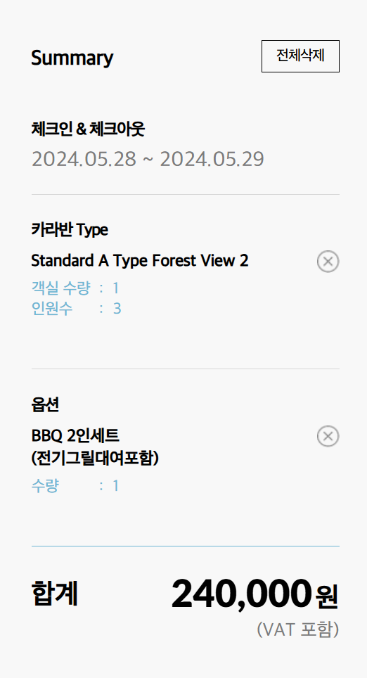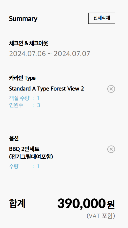 일반적인 평일 이용시 BBQ2인세트 7만원을 포함하는 경우 1박에 24만원이 소요되는데 성수기 주말의 경우에는 같은 옵션이어도 39만원으로 가격이 많이 뛰니 참고하세요