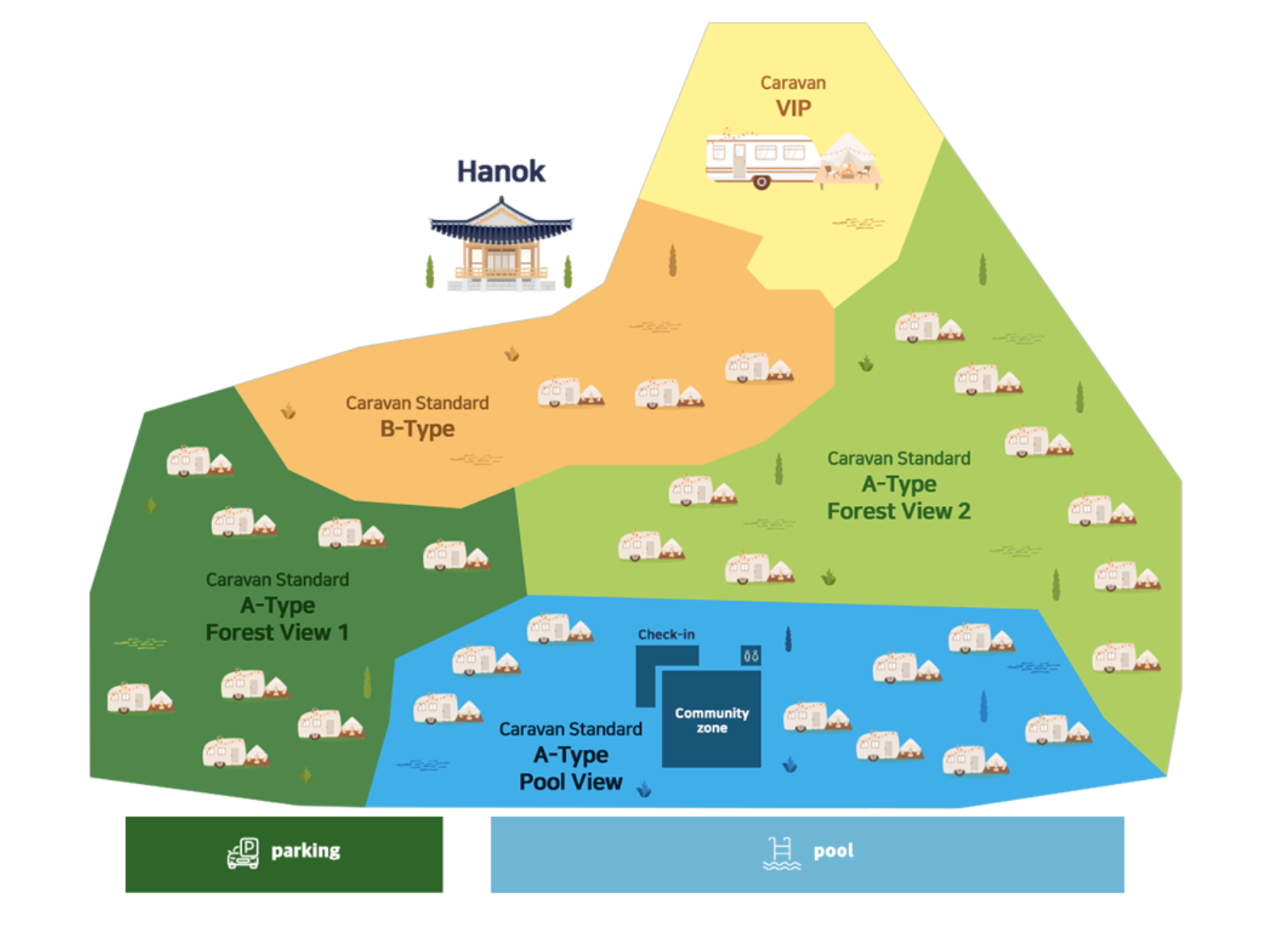 카라반은 더블베드의 A타입과 복층베드의 B타입으로 나뉘는데 우린 더블베드가 좋아서 A타입으로 선택했어요