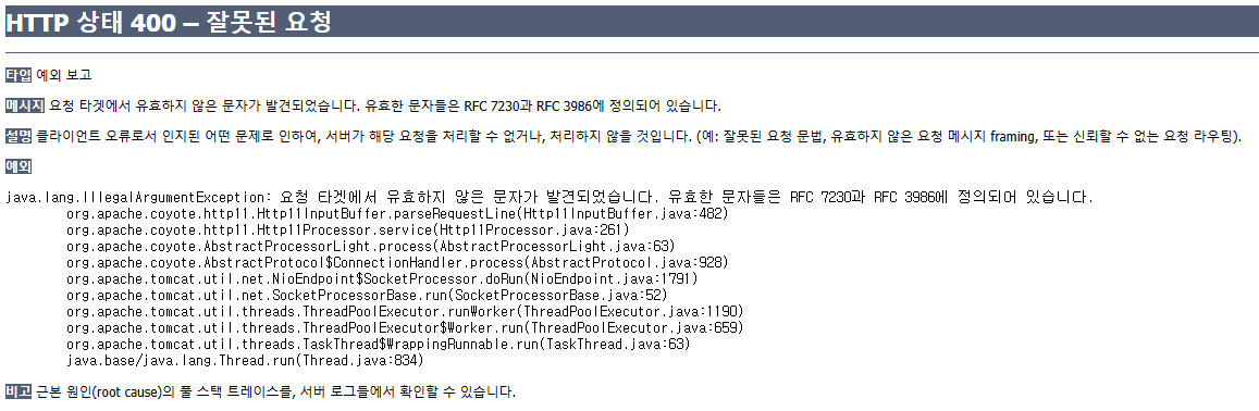 요청 타겟에서 유효하지 않은 문자가 발견되었습니다. 유효한 문자들은 RFC 7230과 RFC 3986에 정의되어 있습니다.