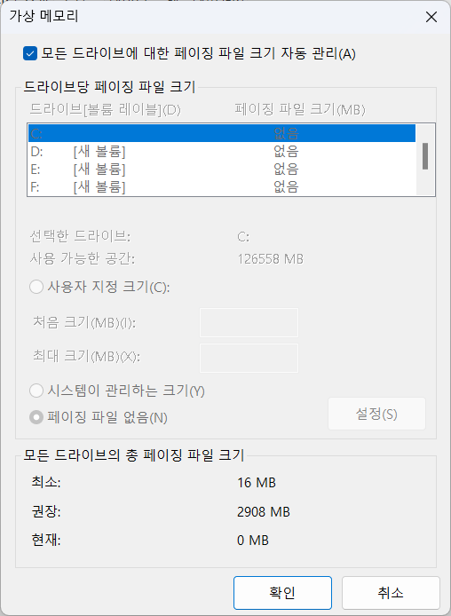 모든 드라이브에 대한 페이징 파일 크기 자동관리가 체크해제 되어 있었고, 페이징 파일 없음으로 설정되어 있었습니다.