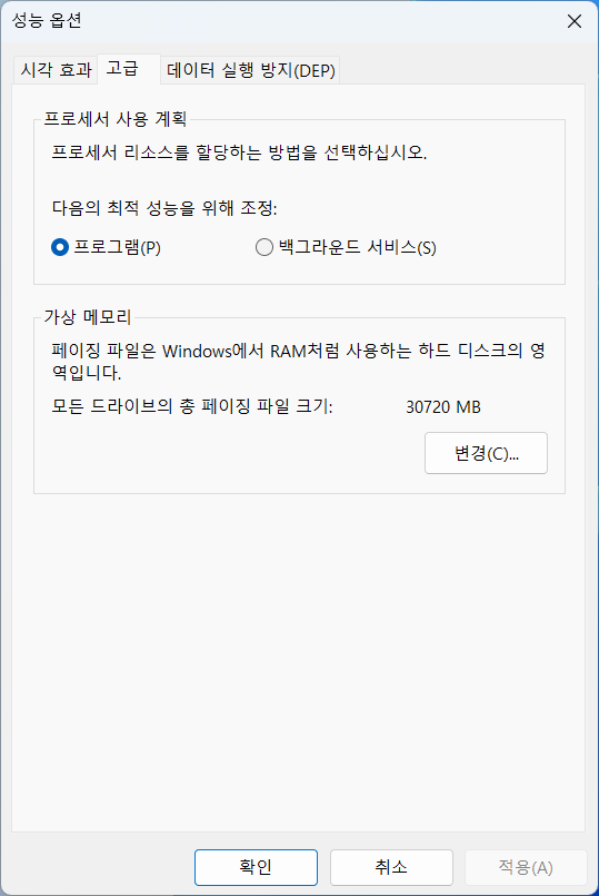 재부팅 후 다시 시스템 환경변수 편집의 고급탭으로 와보니 페이징 파일이 설정되어 있습니다.