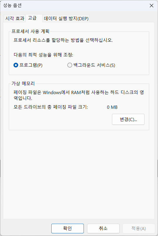그래서 시스템 환경변수 설정으로 들어와 고급탭을 눌러보니 가상 메모리가 0MB로 설정되어 있습니다.