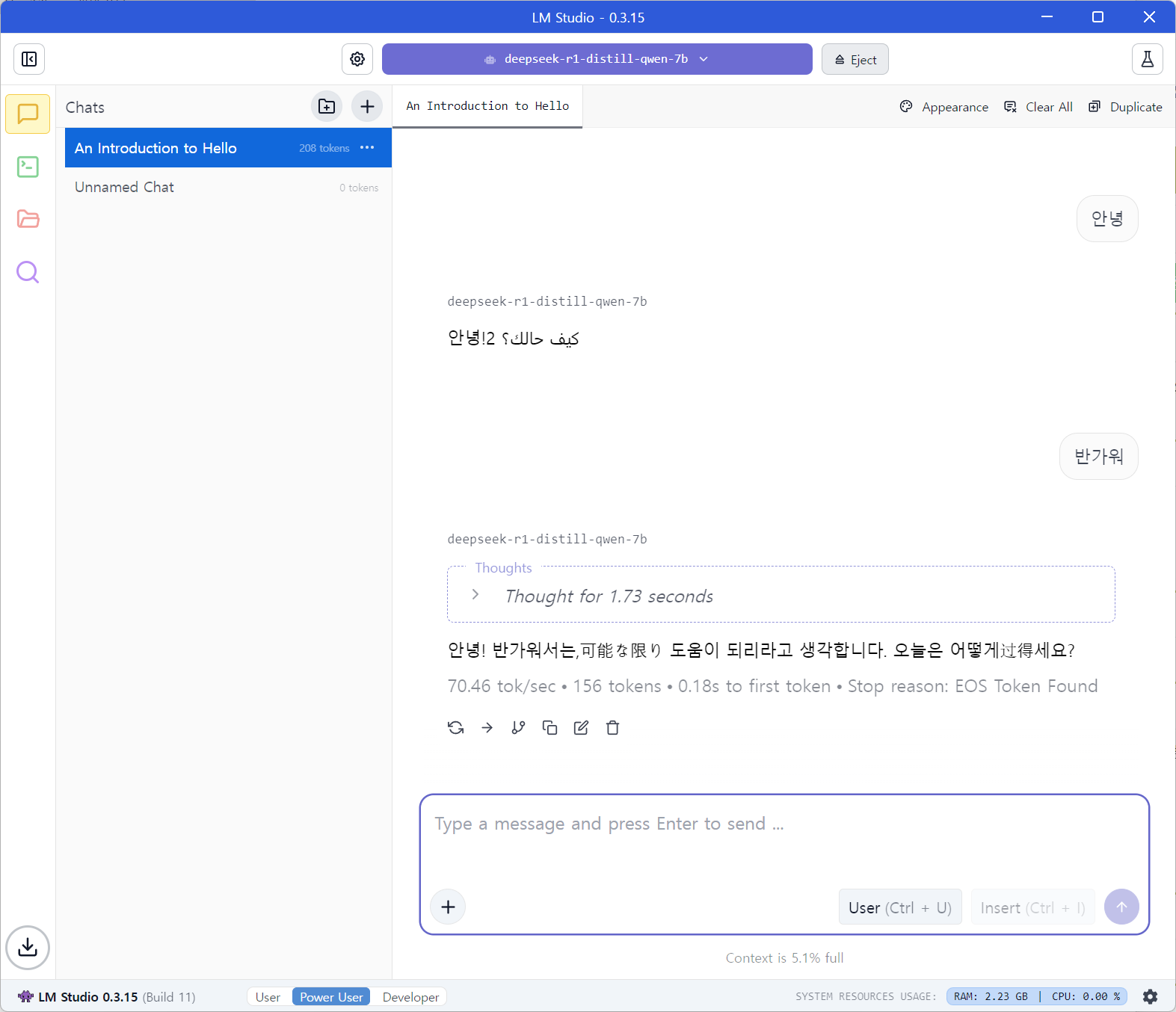 간단히 인사를 나눠보았는데 DeepSeek 모델은 한글이 영 신통찮네요