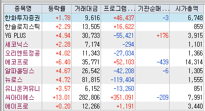 한화투자증권 / 한솔로지스틱 / YG PLUS / 세코닉스 / 오리엔트정공 / 에코프로 / 알파홀딩스 / 뉴로스 / 유니온커뮤니 / 씨아이에스 / 에이프로