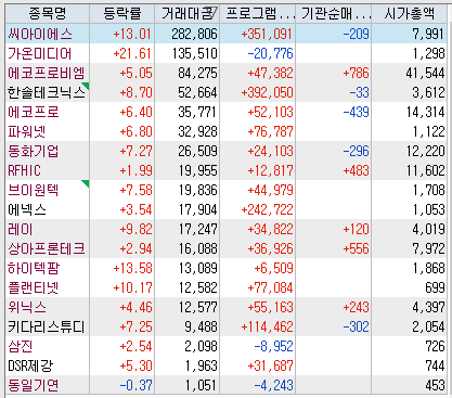 씨아이에스 / 가온미디어 / 에코프로비엠 / 한솔테크닉스 / 에코프로 / 파워넷 / 동화기업 / RFHIC / 브이원텍 / 에넥스 / 레이 / 상아프론테크 / 하이텍팜 / 플랜티넷 / 위닉스 / 키다리스튜디오 / 삼진 / DSR제강 / 동일기연