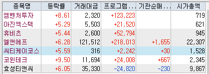 엠벤처투자 / 아진엑스텍 / 휴비츠 / 엘엔에프 / 씨티케이코스 / 코윈테크 / 효성티앤씨
