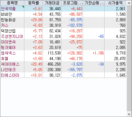 안국약품 / 비비안 / 한농화성 / 카스 / 덕양산업 / 주성엔지니어링 / 아이앤씨 / 팅크웨어 / 엠씨넥스 / 휴젤 / 씨아이에스 / 나인테크 / 티에스아이