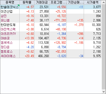 한솔테크닉스 / 이건산업 / 삼진 / 유니셈 / 한미반도체 / 아진엑스텍 / 아프리카TV / 아바코 / 엠씨넥스 / 정다운/ 켐트로스 / 씨아이에스