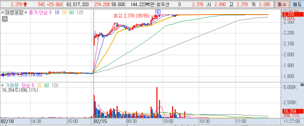 대영포장 장초부터 강하게 가주길래 두번 나누어 매수하고자 했는데 첫번째 물량만 매수체결되버리고 상한가에 들어가주었고 상한가 부근에서 전량 매도해 수익확정 지었습니다. 쿠팡덕에 운이 좋은 매매였네요