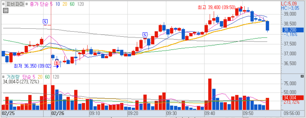 시장이 갭하락 하면서 모든 종목이 음봉이길래 전일 가려는 힘이 강했던 피비파마를 공략해보았습니다. 고점 매도는 못했으나 저항이라고 생각되는 지점에서 전량 매도해 약수익 마감했네요