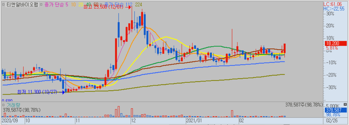 이미 존슨앤존슨 백신의 미 FDA 긴급승인 뉴스가 나온시점에서 갭을 띄운 음봉이 예상되는데요. 행여 재료가 강력해서 해당 구간에서 많은 거래대금을 쌓고 재돌파가 이뤄진다면 더 큰 상승도 기대해볼 수 있을것 같습니다.