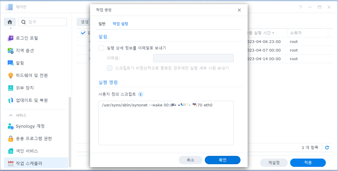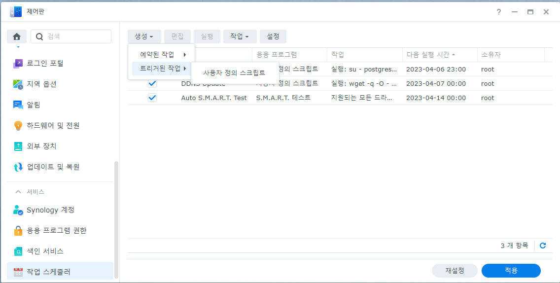 작업명은 임의로 작성해주시고 사용자는 root, 이벤트는 저는 부트업을 선택했는데 사용자가 직접 실행할 명령어라서 임의 지정 하시면 될거 같아요